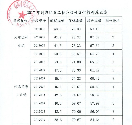 2017临沂河东区第二批公益性岗位招聘总成绩通知 2017-11-08