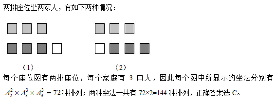 此题需要注意:家庭成员是相邻的而坐,所以对于做4排座位的家庭只有如图所示的两种可能。