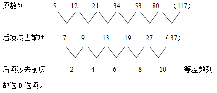 观察数阵的第二行和第三行可以发现规律:第一列与第二列的数字相加再加2等于第三列的数字,6+22+2=30,17+21+2=40,因此?处应为20-7-2=11,故正确答案为B。