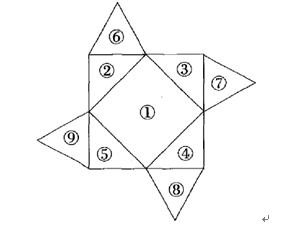 图示为一有底无盖的容器的平面展开图,其中①是边长为18的正方形,②③④⑤是等腰直角三角形,⑥⑦⑧⑨是等边三角形。那么这个容器的容积为
