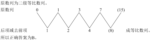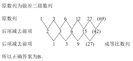 解析3:前一项加上“更前一项的2倍”,等于下一项。具体规律为1×2+3=5,3×2+5=11,5×2+11=21,因此下一项为11×2+21=43。