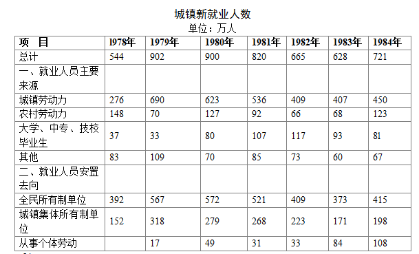 5.与1978年相比,1984年全民所有制单位安置的城镇新就业者的人数比例大约减少了多少个百分点( )。