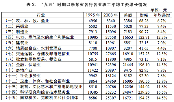 2.根据表2,1995年—2003年间,工资增幅最大的行业是( )。