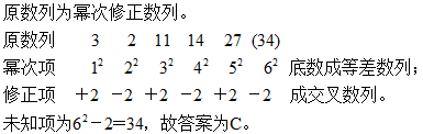 数列每一项除以3均商为质数并且均余1,例如7÷3=2余1,10÷3=3余1,16÷3=5余1,22÷3=7余1,其中2、3、5、7为质数数列,因此原数列下一项为3×11+1=(34),故正确答案为C。