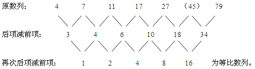 后项减去前项得到新数列:1、3、9、(27),为等比数列。则未知项为15+27=42,故正确答案为B。