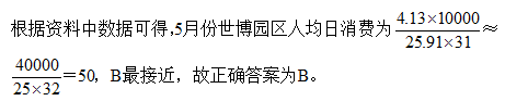 由第二段可知浦西片区销售额占销售总额的比重为1-89.4%=10.6%,5月份世博会浦西片区的销售额为4.13×10.6%≈4×0.11=0.44亿元,故正确答案为B。