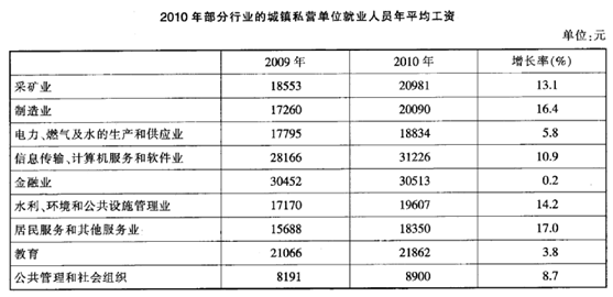 A.2010年工资增长率最高的行业,其平均工资高于2万元