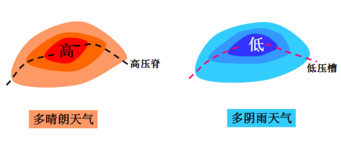 从高气压延伸出来的狭长区域,叫高压脊,好比地形上的山脊,两侧为低压,中间为高压;从低气压延伸出来的狭长区域,叫低压槽,好比地形上的山谷,两侧为高压,中间为低压。高压脊温度大于等压线平坦处,低压槽温度低于等压线平坦处。