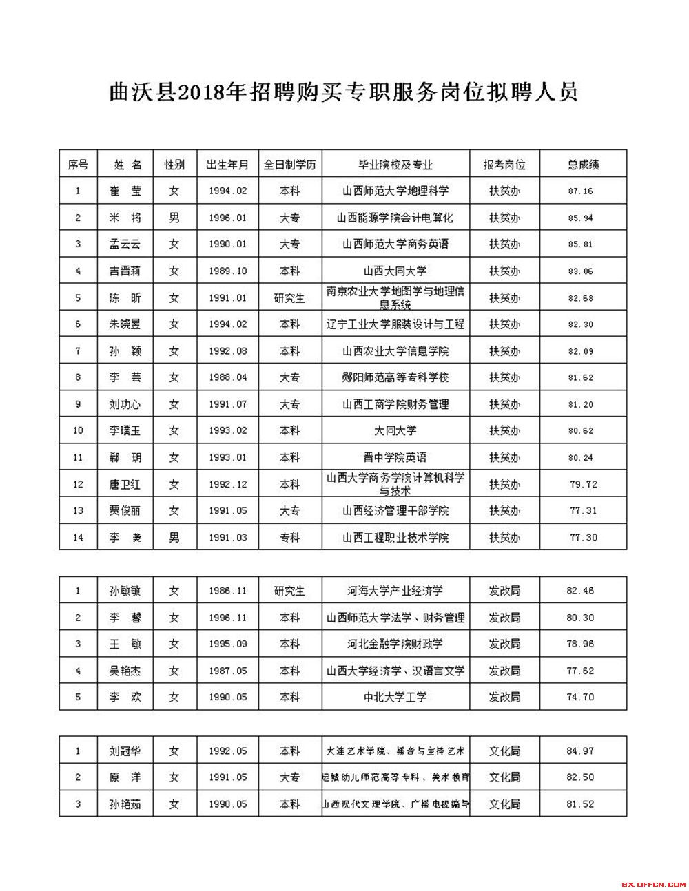 原公告:曲沃县2018年招聘购买专职服务岗位拟聘人员