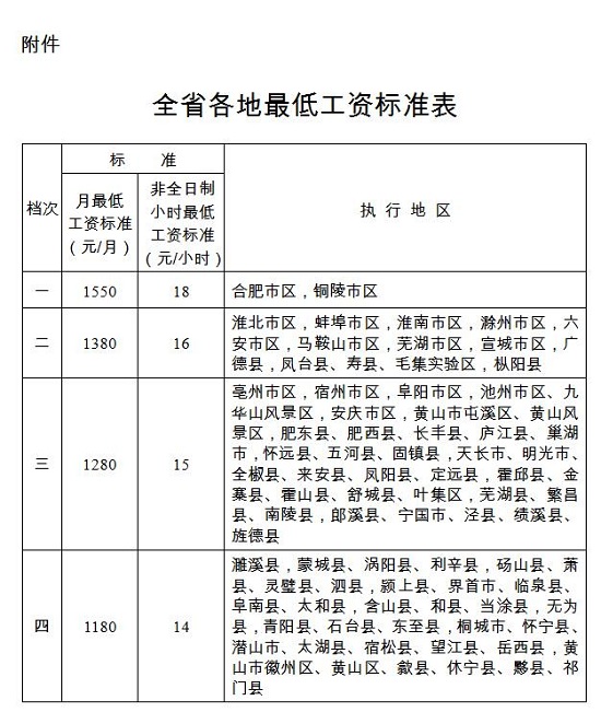 根据《中华人民共和国劳动法》及《安徽省最低工资规定》(省政府令第272号),结合我省经济社会发展状况,省政府决定,自2018年11月1日起,调整全省最低工资标准,请认真贯彻执行。