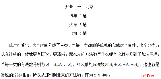 比如说,现在一个人要从郑州去北京,必须在一天之内到达,问有多少种方法数?这个时候在这个事件中就优先将郑州到北京按交通方式分成不同类型,按不同方式去计算方法数。如图所示: