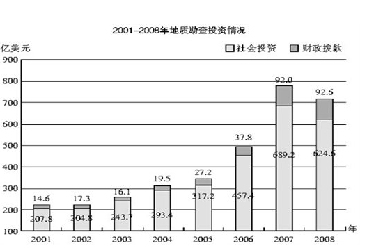 4.2001-2008年,社会投资用于地质勘查投资的资金平均每年约增加( )亿美元。