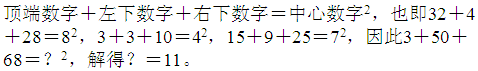 左侧部分:10、21、31、43、51,两两作差得11、10、12、8、(13),为交叉数列,故未知项左侧部分为:51+13=64;