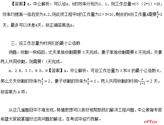 【答案】D。中公解析:可设最小单位量为特值,即一人一天干1份。则工作总量可以表示成
