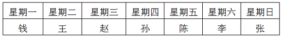 条件1:七人每个星期都只有一个休息日,条件2:每天只能安排一人休息,条件3:张的休息日比李的晚一天,条件4:赵的休息日比钱的晚两天,条件5:王的休息日比陈的早三天,条件6:孙的休息日是星期四,而且恰好处于王和李休息日的中间。