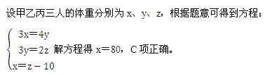 由三个乙的体重相当于二个丙的体重可知,丙的体重可被3整除,又甲的体重比丙轻 10 千克,所以我们只需从选项中寻找加10后可被3整除的数即可,显然只有80符合,故正确答案为C。
