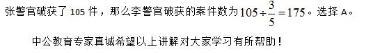 【中公参考解析】A。题干中有倍数字样和分数字样出现,可以考虑能不能应用整除,问题问的是李警官破获的案件数,由题意可知张警官是李警官的五分之三,可知李警官破获的案件数为5的倍数,但是前三个选项均满足,没办法进行排除。再进一步考虑,张警官破获的案件数条件比较多,可以从张警官入手:张警官破获的案件数是王警官的5倍,可知张警官破获的案件数是5的倍数;是李警官的五分之三,可知张警官破获的案件数能被3整除;是越警官的八分之七,可知张警官破获的案件数是7的倍数;三者结合说明张警官破获的案件数同时能被3、5、7整除,而张警官破获的案件数为100多件,符合条件的数字只有105,