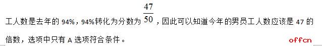 【中公参考解析】A。题干中有百分数出现,故先想一想能不能应用整除法,问题问今年男员工的人数为多少人,而题干中给出今年男员工人数比去年减少6%,也就是今年男员