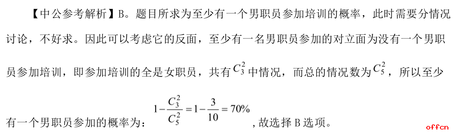 【例3】某科室共有职员5名,其中2名男的,3名女的,现从中随机挑选出2人参加培训,那么至少有一个男职员参加的概率是( )?