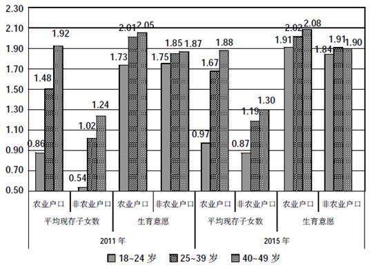 B.与2011年相比,2015年40~49岁年龄段人口的平均现存子女数量的变化量、平均理想子女数量的变化量都是最低的