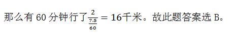 【中公解析】B。本题路程一定,速度和时间成反比,根据步行速度只有骑车的1/4可得到步行时间:骑车时间=4:1,所以所以骑车的时间就是其中的一份,步行时间比骑车时间多3份,3份=22.5分钟,所以1份=7.5分钟,就是说一份的时间是(骑车)7.5分钟走了2公里,