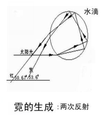 霓又名副虹,它与虹一样,其出现也需要光和水滴,不同的是,霓的形成,需要光在水滴中多发生一次反射,具体的来说就是,当阳光进入水滴时先发生一次折射,之后在水滴背面发生一次反射,反射的光到达的仍是水滴的背面,再次发生反射,之后在离开水滴时再发生一次折射而形成霓(如图3)。由于和虹相比,霓多发生了一次反射,因为能量也有所衰减,所以霓的颜色要比虹的颜色浅,同时由于其比虹多了一次反射,所以其所呈现出的颜色刚好和虹相反,是外紫内红的,位置也常出现在虹的外侧(如图3)。