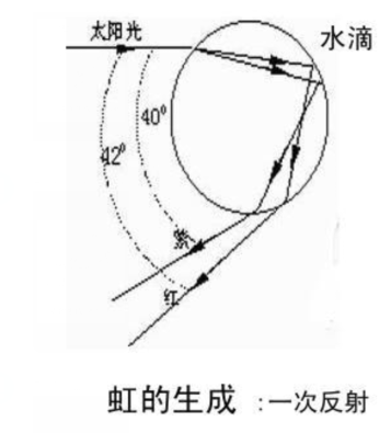 虹也就是我们所说的彩虹,其一般出现在雨后天刚转晴的时候,这个时候天空中有大量的雨滴,当阳光以一定的角度照射到雨滴上时,发生两次折射、一次反射而形成了虹。具体来说就是阳光经过一次折射进入水滴,在水滴背面发生反射,之后在离开水滴时再发生一次折射(如图1)。不同色光的折射率不同,红色光的折射率最小,紫色光最大,因为光在水滴内发生了一次反射,所以观察者看见的光谱是倒过来,这样就呈现出我们日常生活中所看到的由外到内的红、橙、黄、绿、蓝、靛、紫的七色彩虹(如图2)。