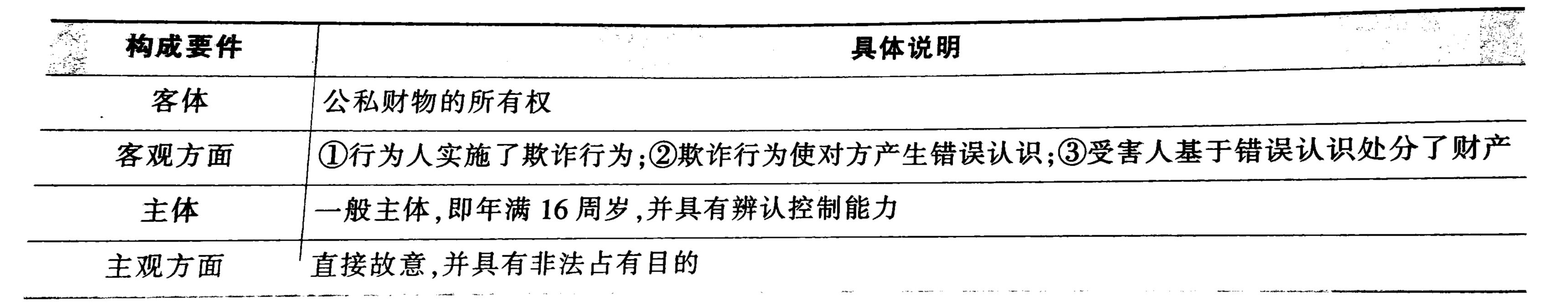 诈骗罪,是指以非法占有为目的,使用虚构事实或者隐瞒真相的方法,骗取数额较大的公私财物的行为。诈骗罪的构成要件如下表所示:
