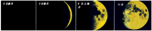(四)下弦月:满月以后,月球升起的时间一天比一天迟了,月球亮的部分也一天比一天看到的小了,到了农历二十三,图7所示。满月亏去了一半,这时的半月只在下半夜出现于东半天空中,这就是“下弦”。