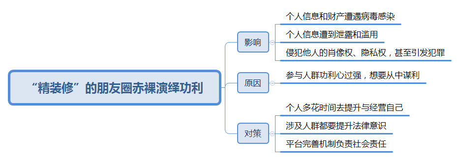朋友圈本身应该是这样的一个空间,用户通过朋友圈发表文字和图片,同时可通过其他软件将文章或者音乐分享到朋友圈,希望被好友关注到,当然也可以对好友新发的照片、信息进行“评论”或“点赞”,是我们维持社交的一个重要工具和手段。但现如今,却有越来越多人带着极强的功利目的,急着对自己的朋友圈进行“精装修”,我认为这是一种极其危险的改造,一旦失控,必将伤人害己。