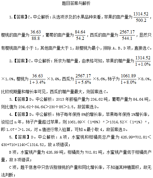 D项,金橘产量为12.65吨,同比增长1.3%,砂糖橘产量为152.75吨,同比下降0.7%,由于砂糖橘产量比金橘10倍还要多,故起决定性作用的是砂糖橘产量,故D项正确。