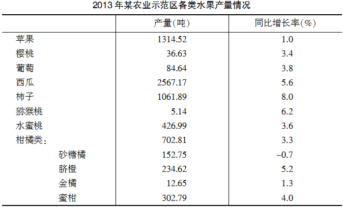 2.该农业示范区下列水果2013年较2012年增产量最多的是: