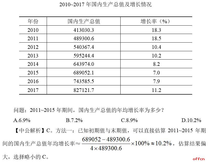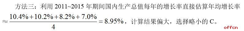 方法二:2011~2015年期间国内生产总值每年的增长率已知,可以根据增长率估算范围。此期间增长率最小为7.0%,最大为10.4%,故年均增长率一定在此范围内,排除A。再观察期间每一年国内生产总值逐年增长,但是并没有出现断崖式大跃进,基本均匀,因此年均增长率不会特别接近7.0%或者10.4%,排除BD,选择C。