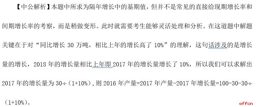 【中公解析】本题考察的是求解现期是基期的几倍问题,但是并没有像常见考察中的直接给出现期值和基期值,只给了增长率。这里考察的是考生对于多几倍问题的一个理解,在资料分析中我们总结过多几倍=增长率,所以在本题中增长10%即为多0.1倍,根据是几倍=多几倍+1,则可以推出2018年产量是2017年的1.1倍。