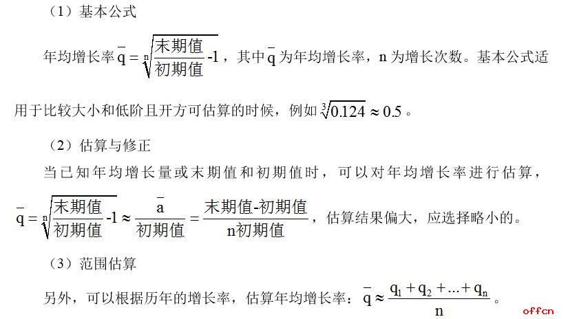年均增长率是几何平均数,一方面几何平均数小于算术平均数;另一方面,几何平均数符合平均数的基本特点,因此也可以利用平均数的基本特点对选项进行判断——年均增长率一定介于历年增长率的最小值和最大值之间,例如:2001~2010年之间,最小的年增长率为12%,最大的年增长率为15%,那我们可以判断年均增长率一定在12%至15%之间。若增长率分布较为均匀(中轴线两边差距可以忽略时),基本可以判断出年均增长率在中点邻域中。并且结合几何平均数小于算术平均数的特点,基本可以判定年均增长率在中点左邻域(即小于算术平均数)。