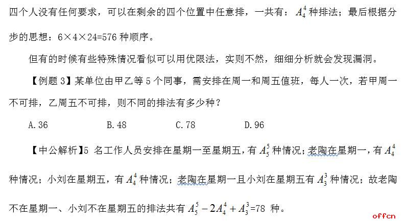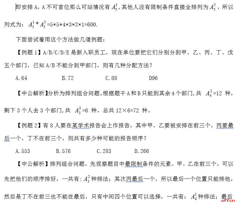 在行测学习中,很多同学会果断放弃数量关系这一环节,把一切交给命运。即使是理科生不完全放弃数量,但是在挑题做的时候也往往对排列组合无动于衷,显然这是不明智的,只要方法掌握合理,排列组合绝对是性价比很高的一类题,方法常规,计算量小,分数轻轻松松手到擒来。其实排列组合中常用的方法有很多,比如优限法、捆绑法、插空法、间接法等等。中公教育专家在此为大家介绍“常驻嘉宾”——优限法。