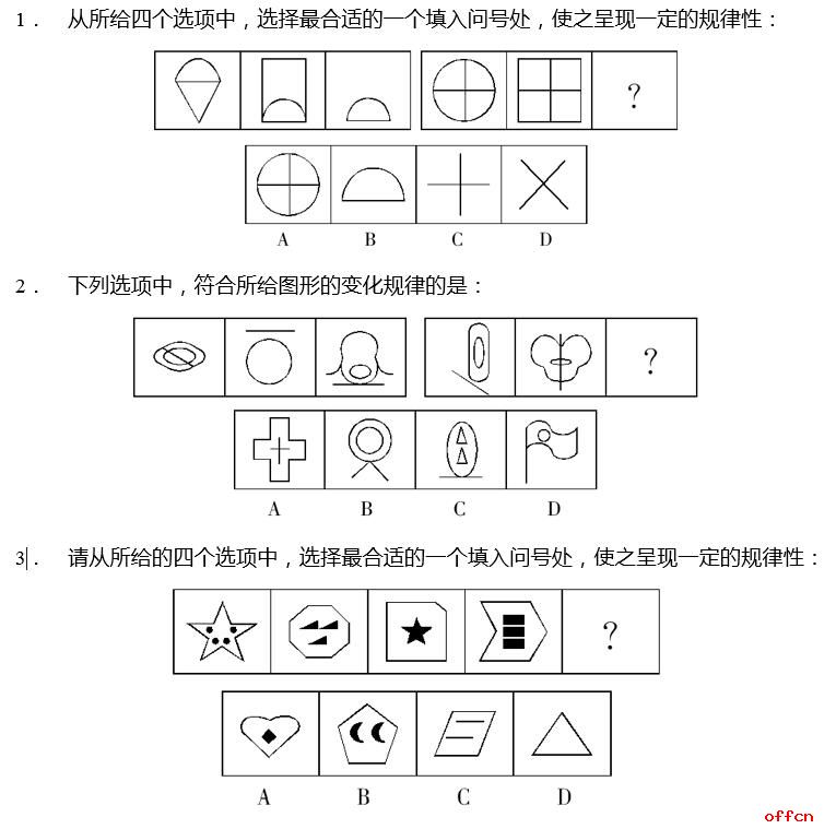 1.【答案】C。中公解析:第一组前两个图形去异存同得到第三个图形,第二组前两个图形均包含“+”,选C。