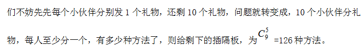 例题:把15个相同的礼品分给锅碗瓢盆缸5个小伙伴,每人至少分2个,问共有几种分法?