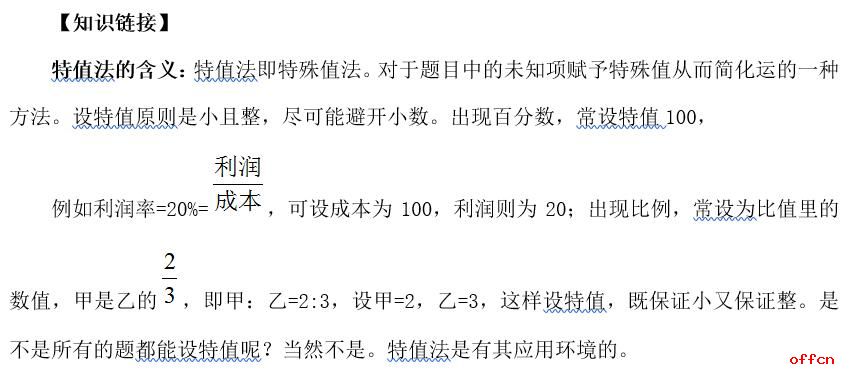 特值法的含义:特值法即特殊值法。对于题目中的未知项赋予特殊值从而简化运的一种方法。设特值原则是小且整,尽可能避开小数。出现百分数,常设特值100,