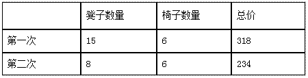 第二次比第一次少了7个凳子,总价少318-234=84元,由题干分析可以得到,总价的减少是由凳子数量的减少造成的,所以凳子的单价为总价减少的量除以凳子减少的个数,即84÷7=12元。