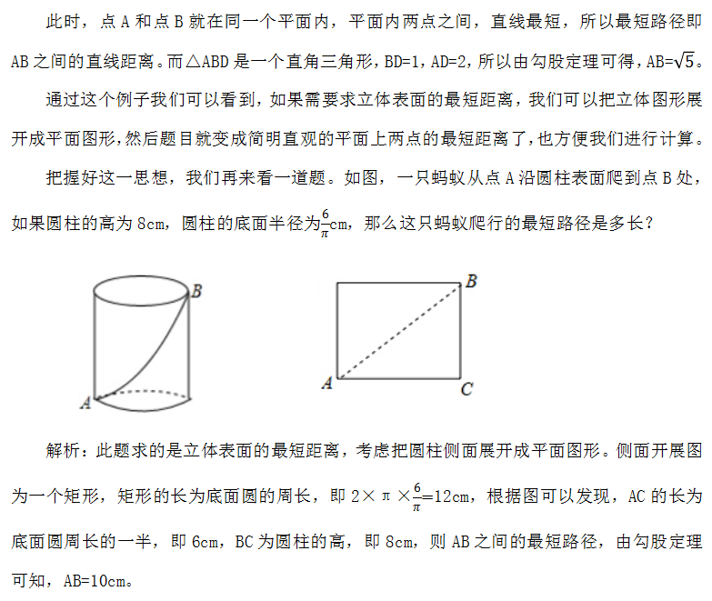通过简单的转换,就可以绕过空间想象,把立体图形转变为简单易解的平面图形,题目也就迎刃而解了。希望通过上面的两个例子,能给同学们一点启发,把握好此类题目的解题方法,通过适当练习,对方法以及几何所涉及的公式都进行练习和掌握,攻克几何问题。