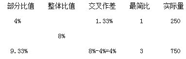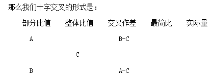 那么这里的A、B就是溶液问题中混合之前的溶液浓度,C则为混合后最终的溶液浓度,注意交叉作差的时候我们是用大数与小数作差,C一定介于A.B之间,这样按照我们的格式进行运算即可。在这里大家要注意一下十字交叉法是存在一些规律的:第一个是左边三列存在交叉作差的关系;第二个是右边三列存在比值相等的关系;第三个是第一列的差与第三列的和相等。作差得到的结果化简后就得到了最简比,那么如果想求任意一个的实际量根据比例的份数就可以求解。
