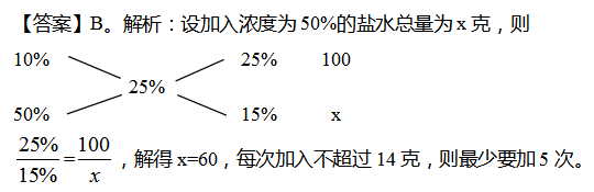 3. 烧杯中装了100克浓度为10%的盐水。每次向该烧杯中加入不超过14克浓度为50%的盐水,问最少加多少次之后,烧杯中的盐水浓度能达到25%?(假设烧杯中盐水不会溢出)