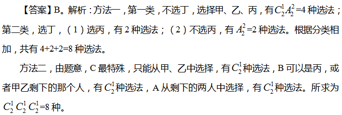 1. 有A、B、C三台不同机器,甲、乙、丙、丁四名操作人员的技术等级各不相同,甲、乙两人这三台机器均能操作,丙不能操作C机器,丁只能操作A机器。从这四名操作人员中选出3人分别操作这三台机器,问不同的选派方法有多少种?