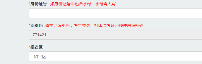 表示项目填写格式错误,按照页面提示标准填写。注册页面自动生成识别码,请考生牢记。考生手机会收到识别码短信,请勿删短信。