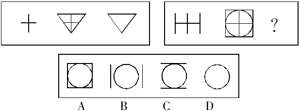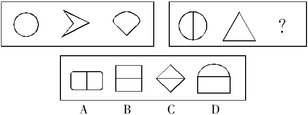 1.【答案】D。中公解析:两组图形结构上具有相似性,第一个图形都有“圆”,第二个图形都有“角”,第三个图形既有“圆”又有“角”。