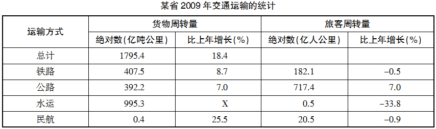 D项,由表格第六行可知,2009年水运货物周转量远大于旅客周转量,正确。
