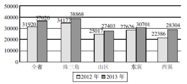 2、2014年,如果按照2013年的增长速度不变,下列区域的城镇私营企业人员平均收入从高到低排列正确的是: