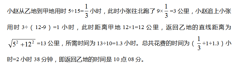 3、甲地在乙地正东5公里,某天早上7点30分,小赵从乙地出发,以每小时15公里的速度骑车前往甲地找小张,但在小赵出发的同时,小张也出发以每小时9公里的速度向正北方向跑步锻炼。小赵到甲地后立刻沿小张跑步的路径以每小时12公里的速度追小张,追上小张后,两人以每小时10公里的速度从相遇点沿直线距离返回乙地。问返回乙地时的时间是几点?