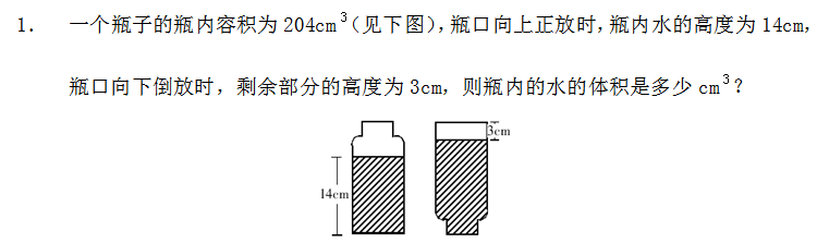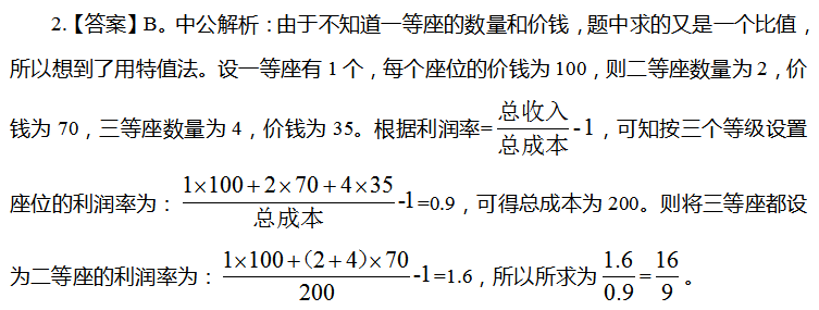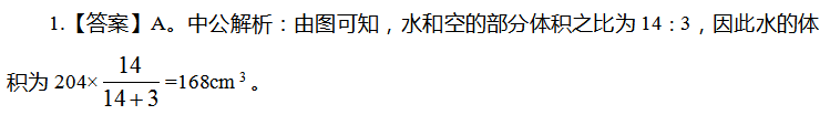 3.【答案】C。中公解析:设每瓶甲、乙、丙溶液中含有酒精的量分别为x,y,z,根据两两混合之后的浓度,可知x+y=(3+7)×50%=5,x+z=(3+9)×50%=6,y+z=(7+9)×60%=9.6。以上三式相加除以2,可得x+y+z=10.3。如果要求甲、乙、丙各一瓶混合之后浓度为50%,需要加纯净水10.3÷50%-(3+7+9)=1.6公斤。